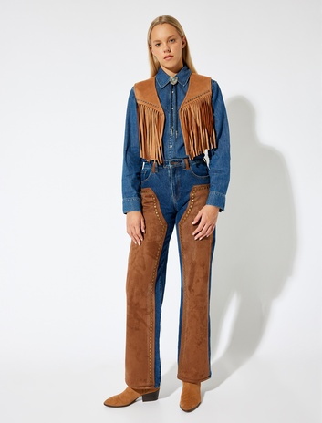 Süet Görünümlü Yelek Kolsuz V Yaka Püsküllü Metal Boncuk Detaylı Sepete Ekle