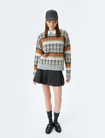 Bisiklet Yaka Rahat Kalıp Uzun Kollu Çok Renkli Etnik Kazak