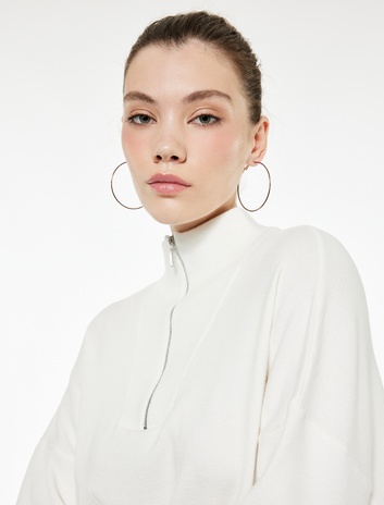Uzun Kollu Dik Yaka Viskon Karışımlı Yarım Fermuarlı Triko Kazak
