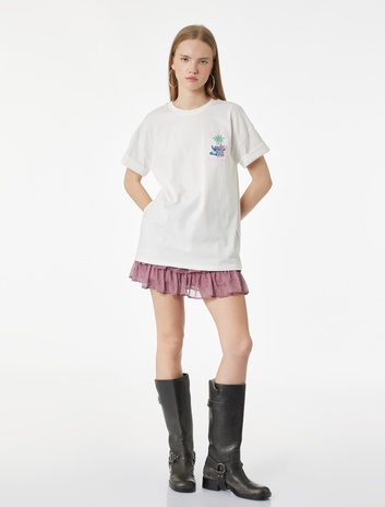 Çiçek Nakışlı Kısa Kollu Bisiklet Yaka Pamuklu Oversize Tişört Sepete Ekle