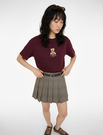 Ayıcık Nakışlı Kısa Kollu Bisiklet Yaka Pamuklu Oversize Tişört