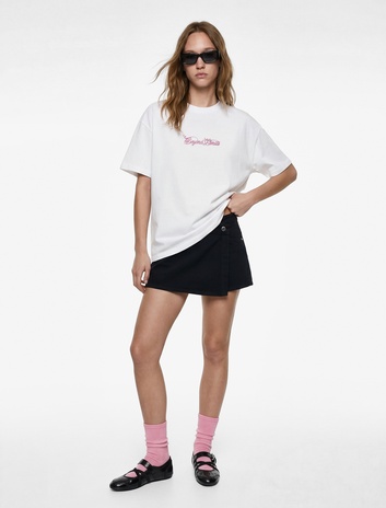 Pamuklu Kısa Kollu Bisiklet Yaka Fiyonk Baskılı Oversize Tişört
