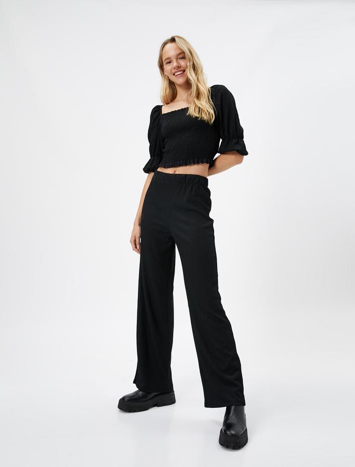 Beli Lastikli Pantolon Düz Paça Dokulu Bürümcük