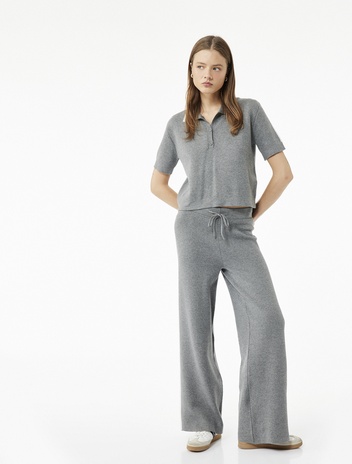 Viskon Karışımlı Yüksek Bel Bağcıklı Geniş Paça Triko Pantolon