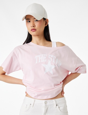 Rahat Kalıp Omzu Açık Kısa Kollu Baskılı Tişört Sepete Ekle