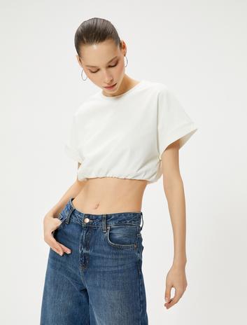 Crop Tişört Etek Ucu Lastikli Kısa Kollu Bisiklet Yaka Pamuklu