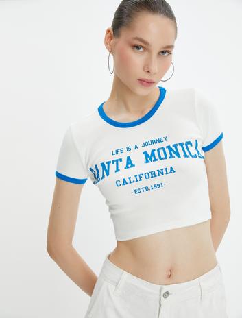 Crop Tişört Baskılı Slim Fit Bisiklet Yaka Kısa Kollu
