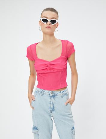 Crop Tişört Transparan Detaylı Kalp Yaka Bürümcük