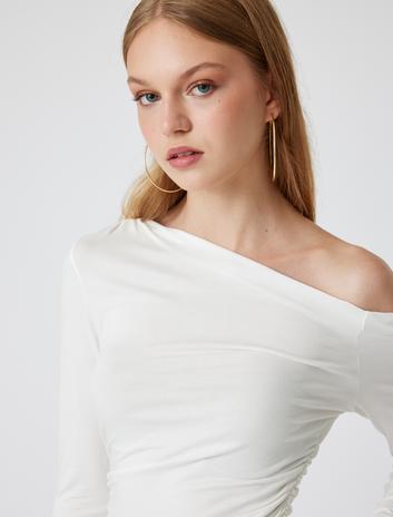 Madonna Yaka Omzu Açık Tişört Uzun Kollu Drapeli Slim Fit Viskon Karışımlı