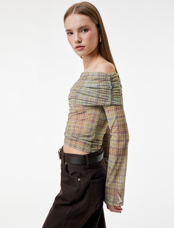 Uzun Kollu Slim Fit Omzu Açık Ekose Tişört Sepete Ekle