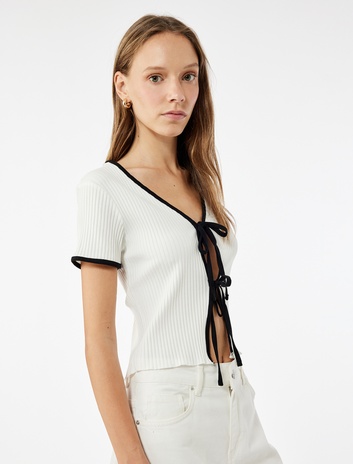Pamuklu Kısa Kollu Bağlama Detaylı Fiyonklu Tişört