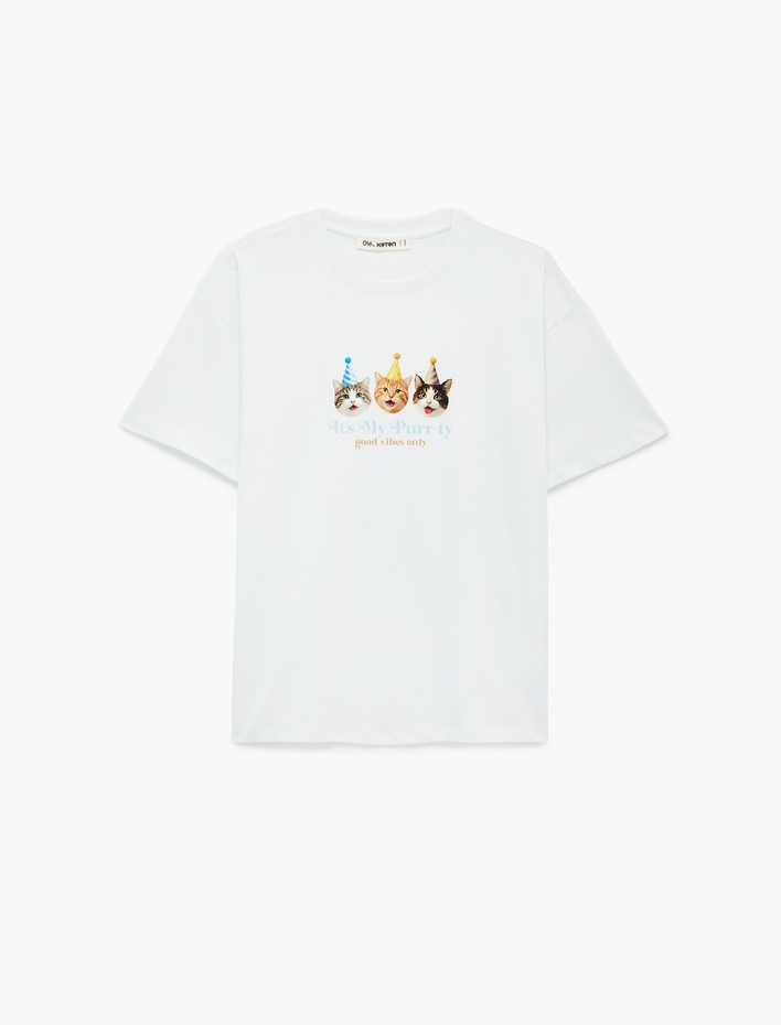 Pamuklu Rahat Kalıp Kısa Kollu Bisiklet Yaka Kedi Baskılı Tişört Sepete Ekle