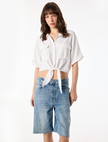 Aerobin Kumaş Rahat Kalıp Kısa Kollu Bağlama Detaylı Cepli Yazlık Gömlek Sepete Ekle
