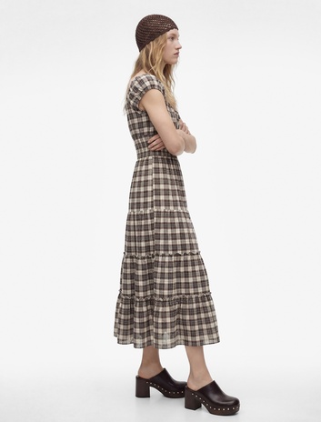 Rahat Kalıp Kısa Kollu Kareli Bağcıklı Katlı Gipeli U Yaka Midi Elbise Sepete Ekle
