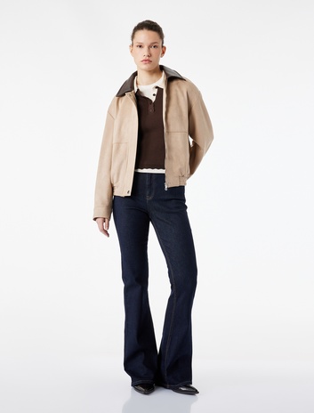 Suni Deri Cep Detaylı Fermuarlı Uzun Kollu Dik Yaka Crop Ceket