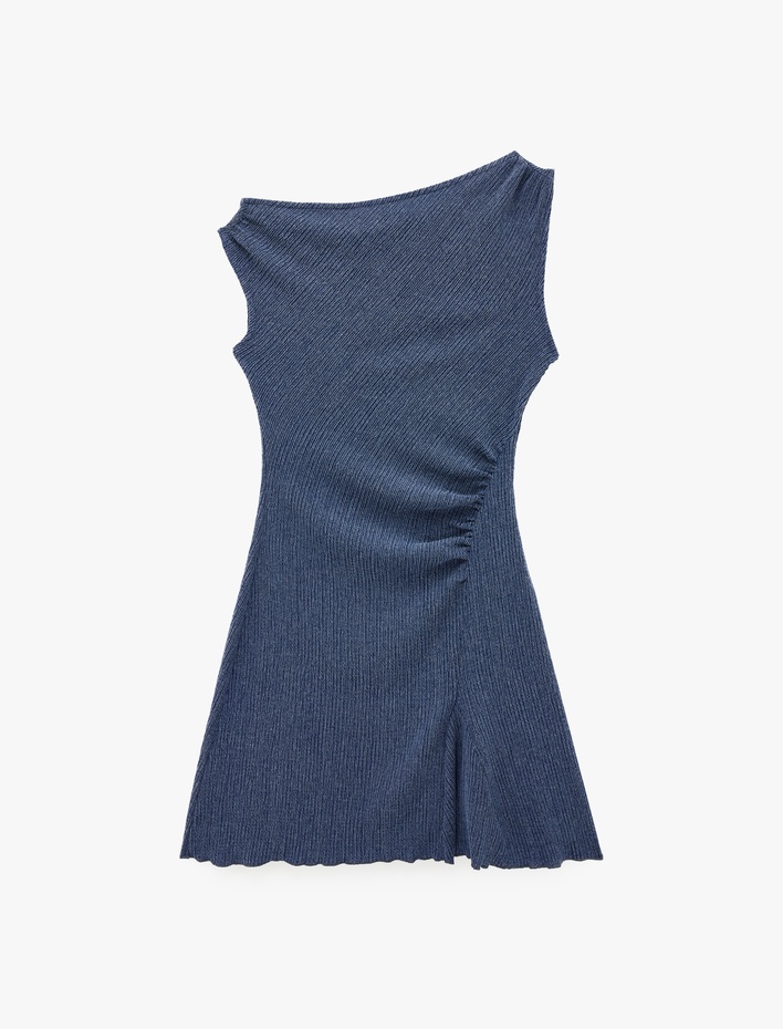 Bürümcük Kolsuz Kayık Yaka Büzgülü Asimetrik Mini Elbise Sepete Ekle