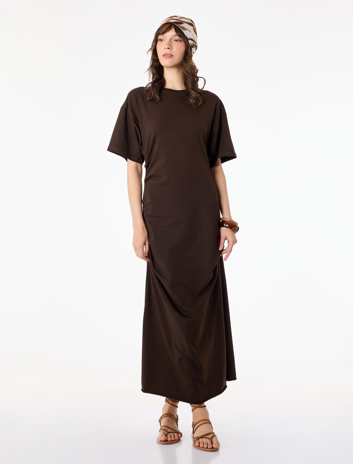 Büzgü Detaylı Kısa Kollu Bisiklet Yaka Pamuklu Uzun Elbise Sepete Ekle