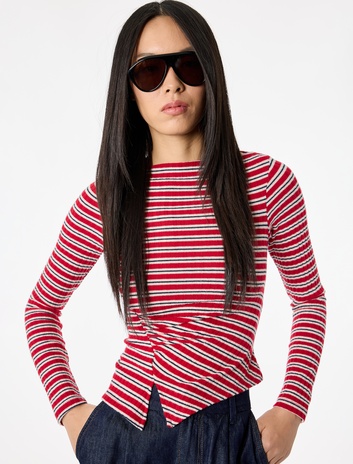 Çizgili Asimetrik Kesim Kayık Yaka Uzun Kollu Bluz