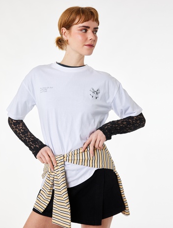 Arkası Baskılı Fiyonklu Rahat Kalıp Kısa Kollu Bisiklet Yaka Pamuklu Tişört Sepete Ekle