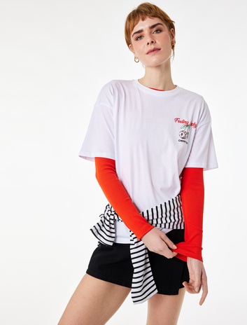 Rahat Kalıp Kısa Kollu Bisiklet Yaka Pamuklu Arkası Kiraz Baskılı Tişört Sepete Ekle