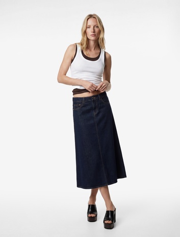 Pamuklu Düğmeli Volanlı Uzun Denim Etek