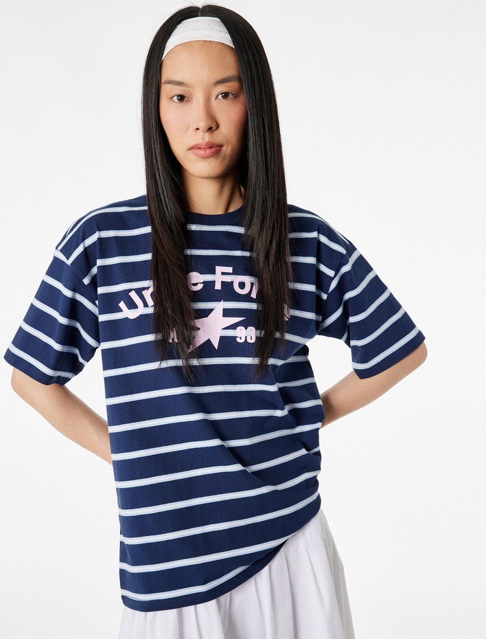 Rahat Kalıp Kısa Kollu Bisiklet Yaka Çizgili Pamuklu Tişört Sepete Ekle
