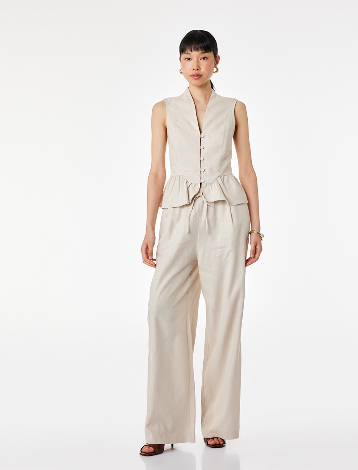 Belden Bağlamalı Cepli Geniş Paça Keten Pantolon Sepete Ekle