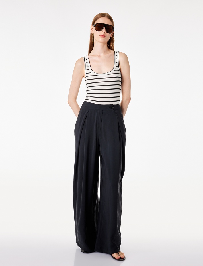 Koton X Sibil Çetinkaya - Pile Detaylı Cepli Çizgili Düz Geniş Paça Kumaş Pantolon