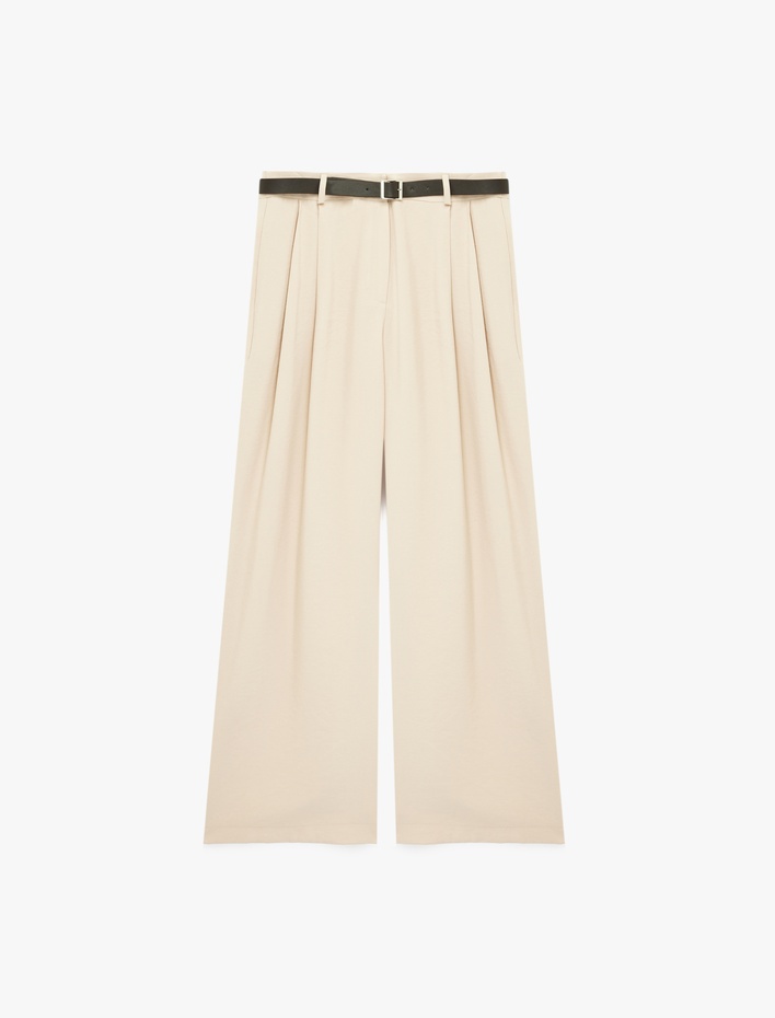Pileli Düz Geniş Paça Kemerli Palazzo Pantolon