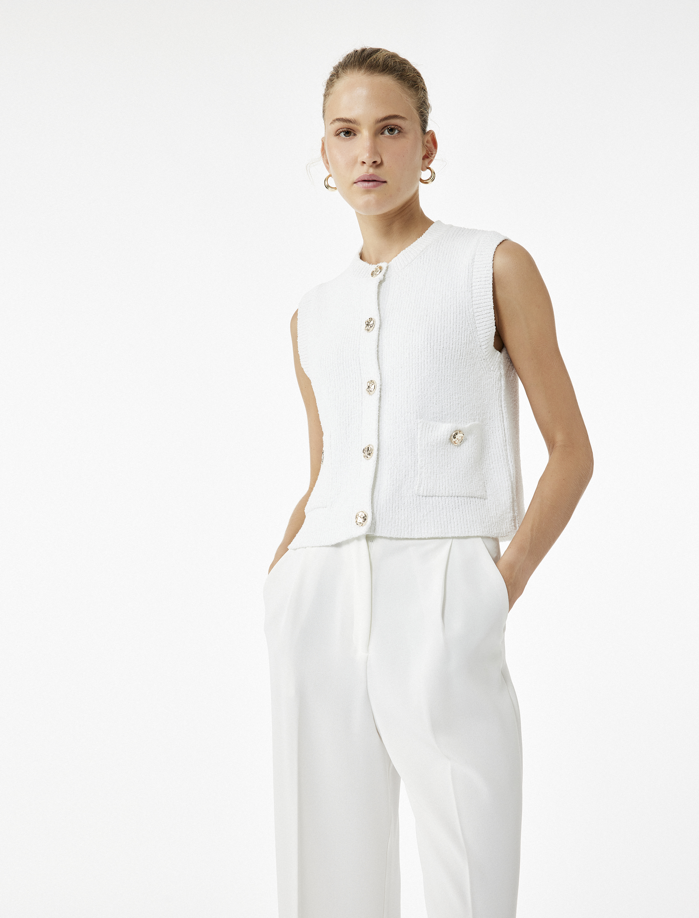 Gold Düğme Detaylı Cepli Kolsuz Bisiklet Yaka Triko Yelek