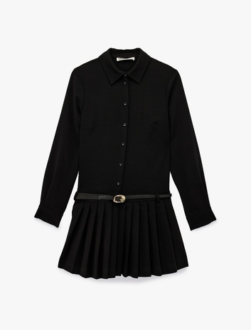 Uzun Kollu Düğmeli Kemer Detaylı Pileli Mini Gömlek Elbise
