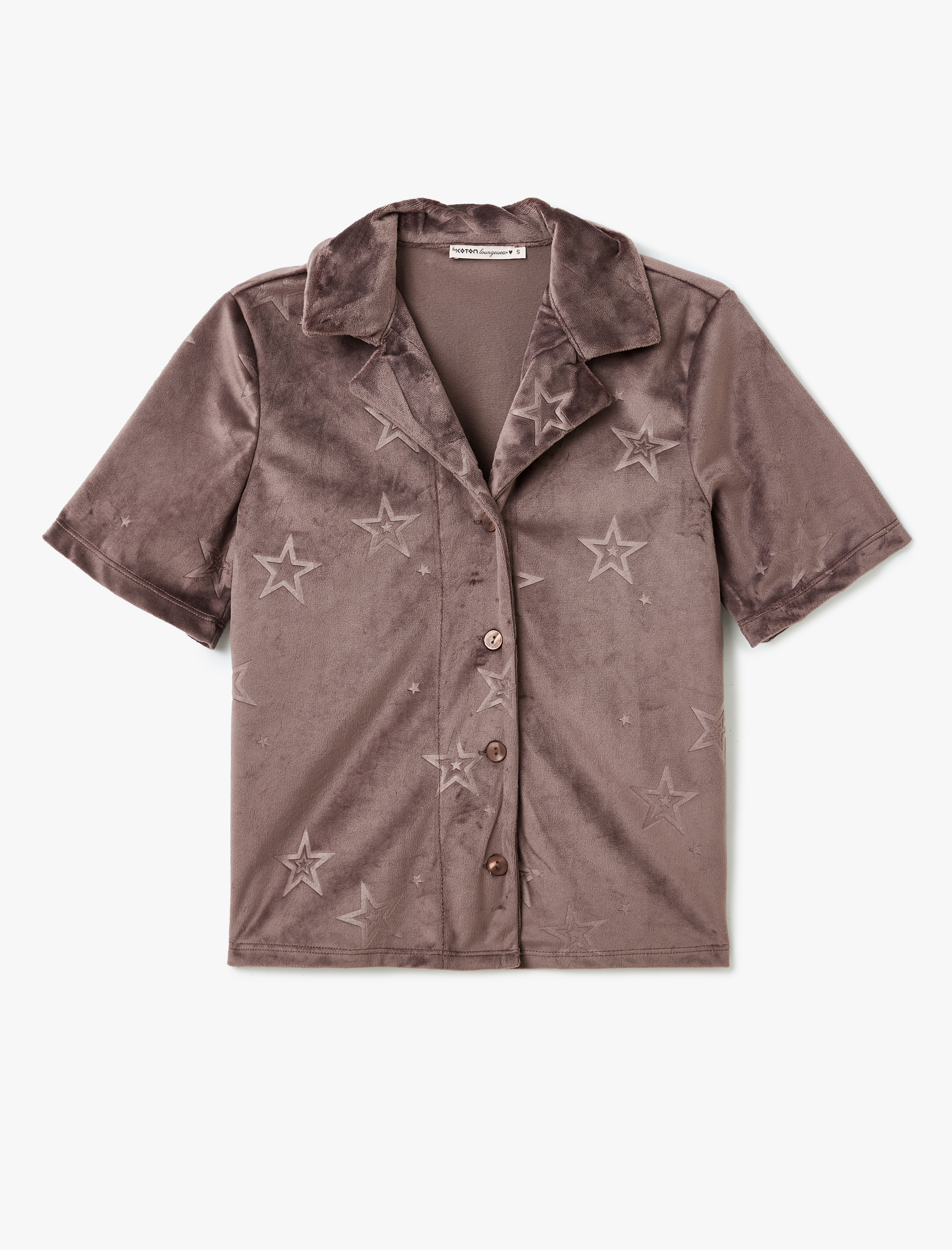 Gömlek Yaka Yıldız Desenli Kısa Kollu Kadife Pijama Üstü