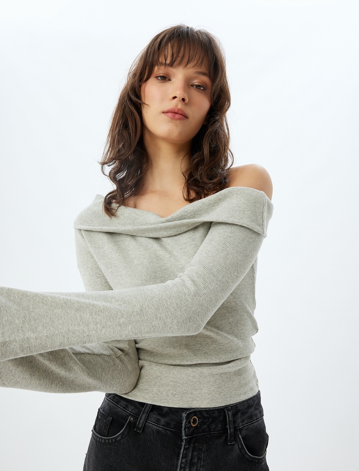 Madonna Yaka Omzu Açık Tişört Kat Detaylı Fitilli Uzun Kollu Slim Fit Sepete Ekle