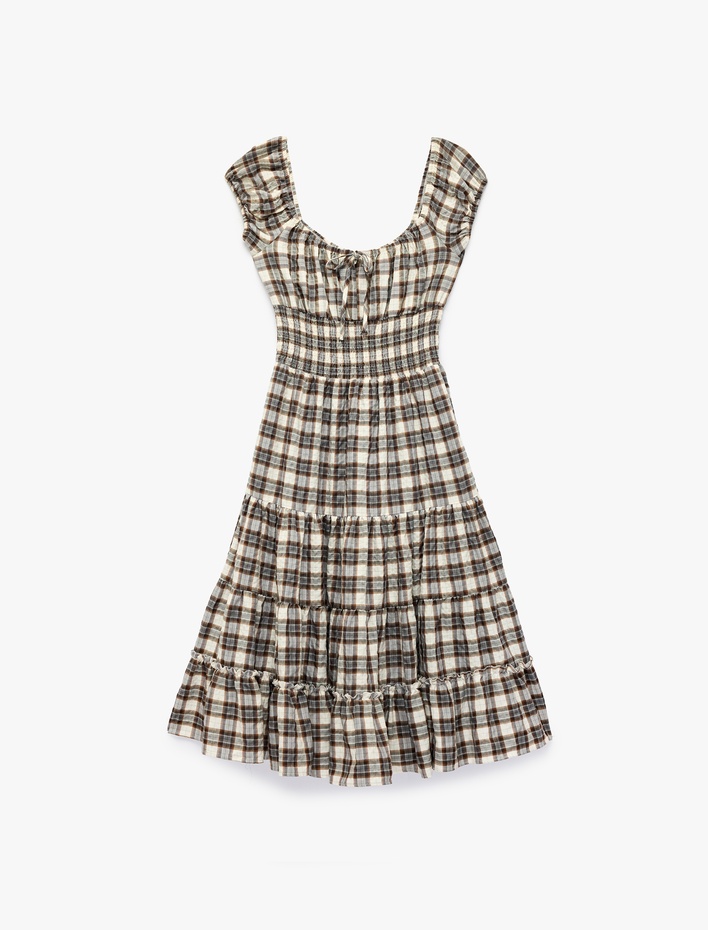 Rahat Kalıp Kısa Kollu Kareli Bağcıklı Katlı Gipeli U Yaka Midi Elbise Sepete Ekle