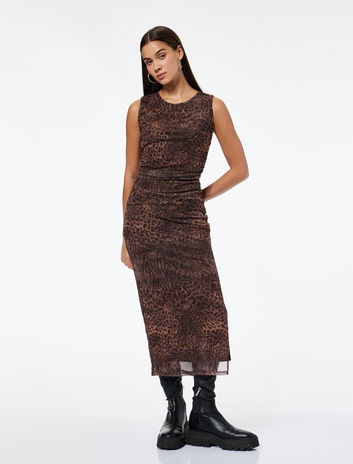 Kolsuz Bisiklet Yaka Yırtmaçlı Drapeli Tül Midi Leopar Elbise