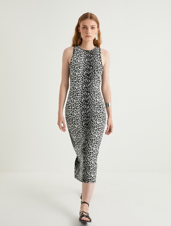 Midi Slip Elbise Bisiklet Yaka Kolsuz Yırtmaçlı