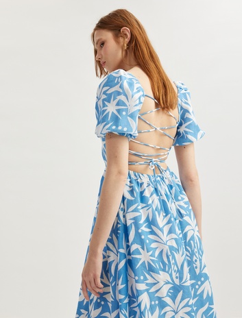 Pamuklu Kısa Balon Kollu Arkası Dekolte Detaylı Midi Boy Çiçekli Elbise
