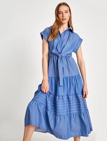 Kap Kol Kaçık Gömlek Yaka Kemerli Midi Elbise