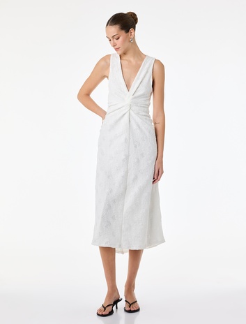 { "id": "8684848604235", "name": "Slim Fit Kolsuz Floral Dokulu Düğüm Detaylı V Yaka Uzun Elbise", "taxonomy":["CITY FASHION","CITY FASHION","WOMEN","JERSEY","DRESSES"], "currency": "TRY", "unit_price": 1299.99 , "unit_sale_price": 1299.99 , "url": "https://www.koton.com/slim-fit-kolsuz-floral-dokulu-dugum-detayli-v-yaka-uzun-elbise-beyaz-4148449-2/", "stock": 33, "color": "BEYAZ", "size": "XL", "product_image_url": "https://ktnimg2.mncdn.com/products/2026/03/16/3215299/18aa277f-a12d-4d19-9e5e-026326d35783_size870x1142.jpg" }
