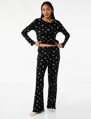 Pamuklu Düz Bol Paça Çiçekli Pijama Altı