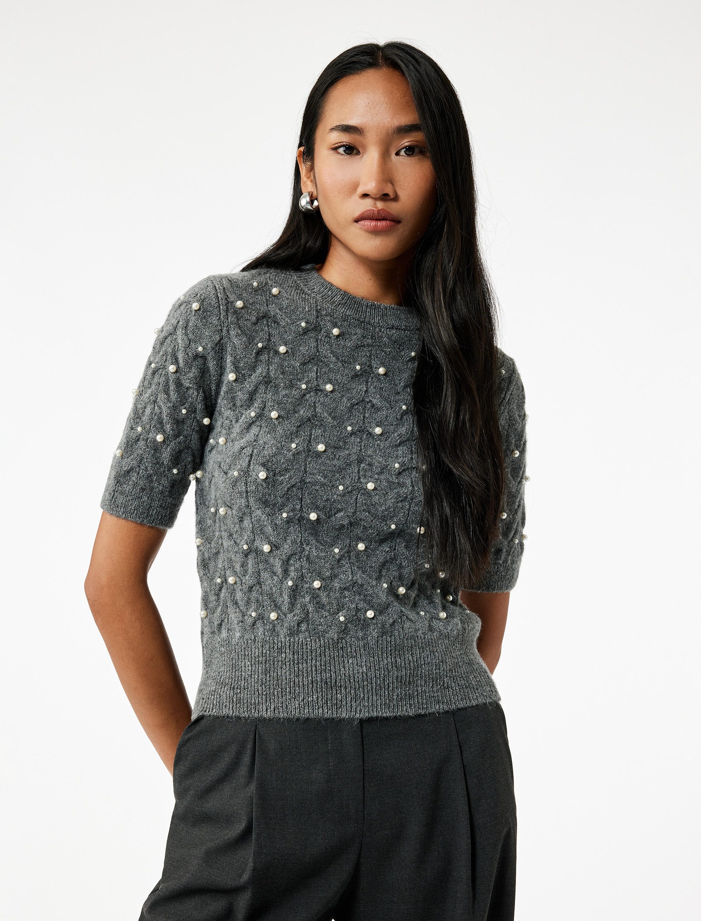 İnci İşleme Detaylı Kısa Kollu Bisiklet Yaka Saç Örgü Kazak