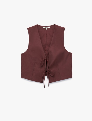 Fiyonklu Önü Bağcıklı Crop Yelek V Yaka Modal Kumaş