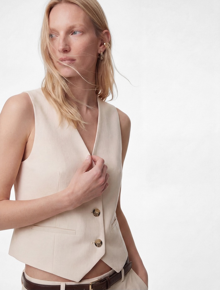 Keten Karışımlı Düğmeli Sırt Dekolteli Halter Yaka Yelek