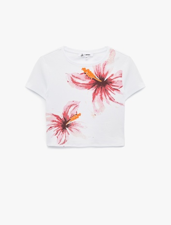 Bisiklet Yaka Çiçek Baskılı Kısa Kollu Tişört
