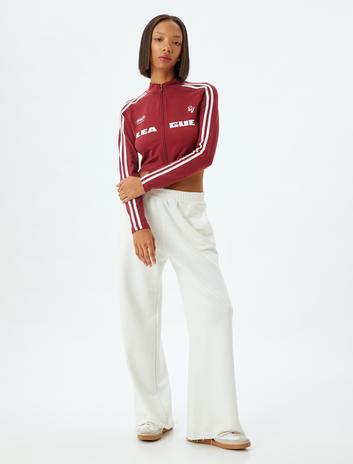 Crop Tişört Fermuarlı Uzun Kollu Kolej Baskılı Dik Yaka Biyeli Slim Fit
