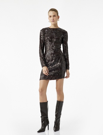 Slim Fit Uzun Kollu Yuvarlak Yaka Sırt Dekolteli Pullu Payetli Mini Elbise