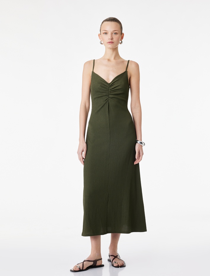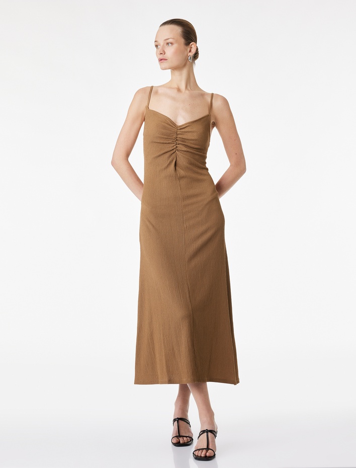 Bürümcük Kumaş Rahat Kalıp Büzgü Detaylı İp Askılı Midi Boy Elbise Sepete Ekle