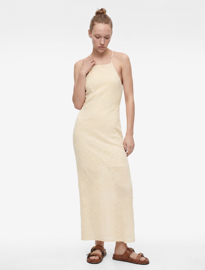 Çapraz İp Askılı Çiçek Nakışlı Sırt Dekolteli Pike Kumaş Uzun Elbise Sepete Ekle