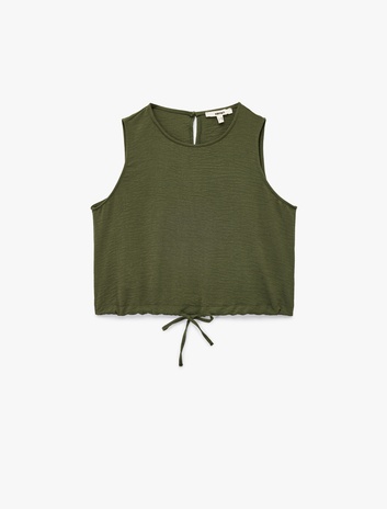 Keten Karışımlı Önden Bağlamalı Fiyonk Detaylı Kolsuz Bluz