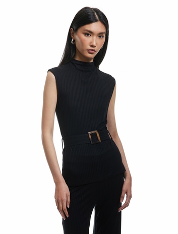Viskon Kumaş Kemer Detaylı Dik Yaka Kolsuz Bluz